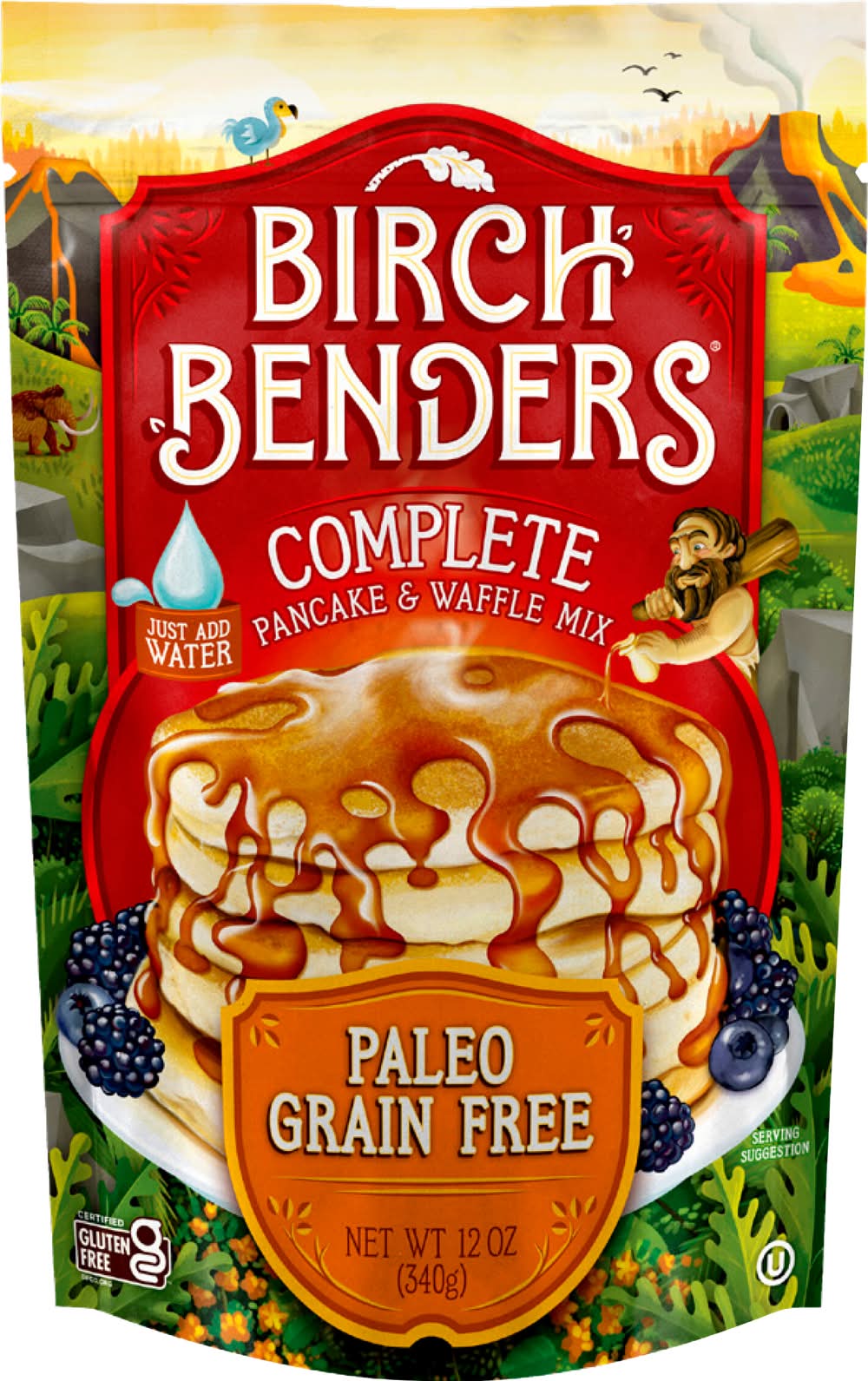 Pancake & Waffle Mix, Complete, Grain Free, Paleo • Flavor: Paleo • Birch Benders LLC, Denver, CO 80211 • Packaging: Reusable