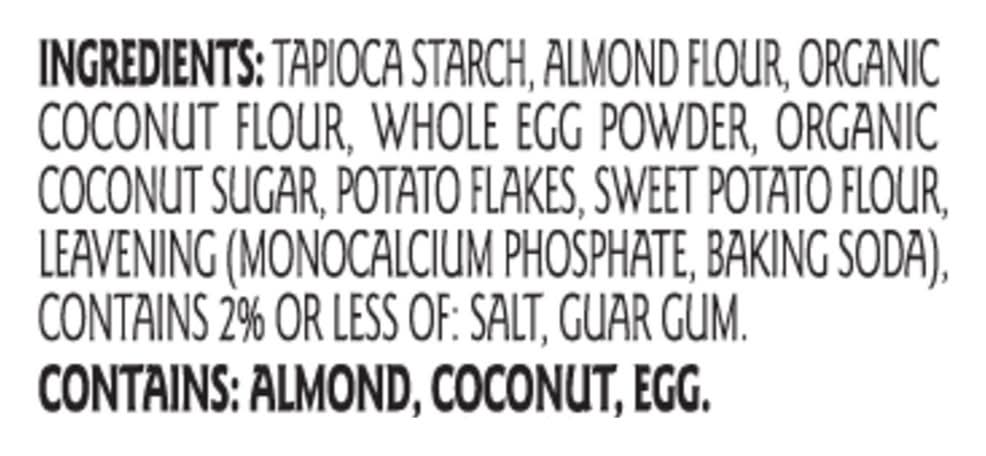 Ingredients: Tapioca Starch, Almond Flour, Organic Coconut Flour, Whole Egg Powder, Organic Coconut Sugar, Potato Flakes, Sweet Potato Flour, Leavening (Monocalcium Phosphate, Baking Soda), Contains 2% or Less of: Salt, Guar Gum Contains: Tree Nuts, Almonds, Tree Nuts, Coconuts, Eggs