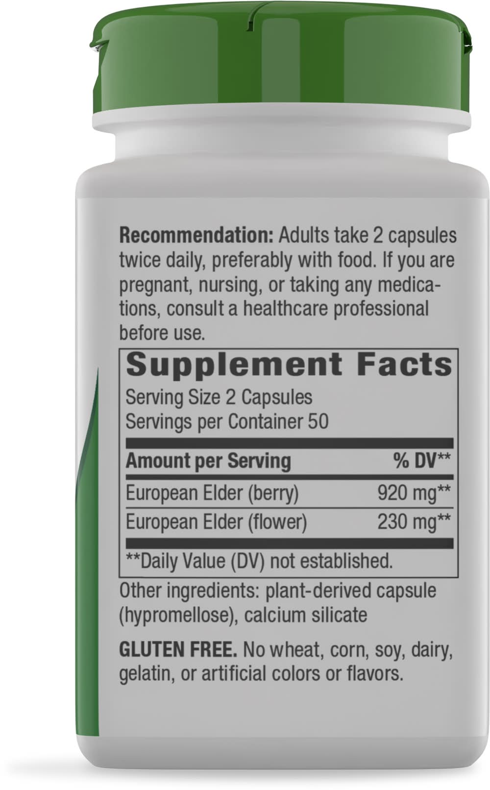 Ingredients: European Elder (berry); European Elder (flower); Plant-Derived Capsule (Hypromellose); Calcium Silicate