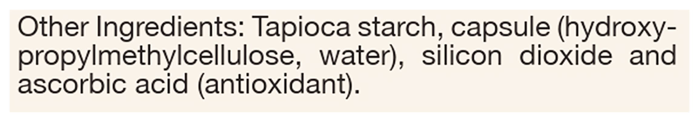 Ingredients: Other Ingredients: Tapioca Starch, Capsule (Hydroxypropylmethylcellylose, Water), Silicon Dioxide and Ascorbic Acid (Antioxidant)