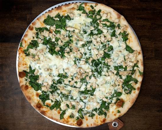 Garlic chicken & spinach with Swiss & Mozzarella cheeses on an olive oil base