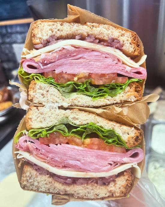 Ham, prosciutto, provolone, lettuce, tomato, onions and balsamic dressing. Served on choice of bread, and includes bagel chips.