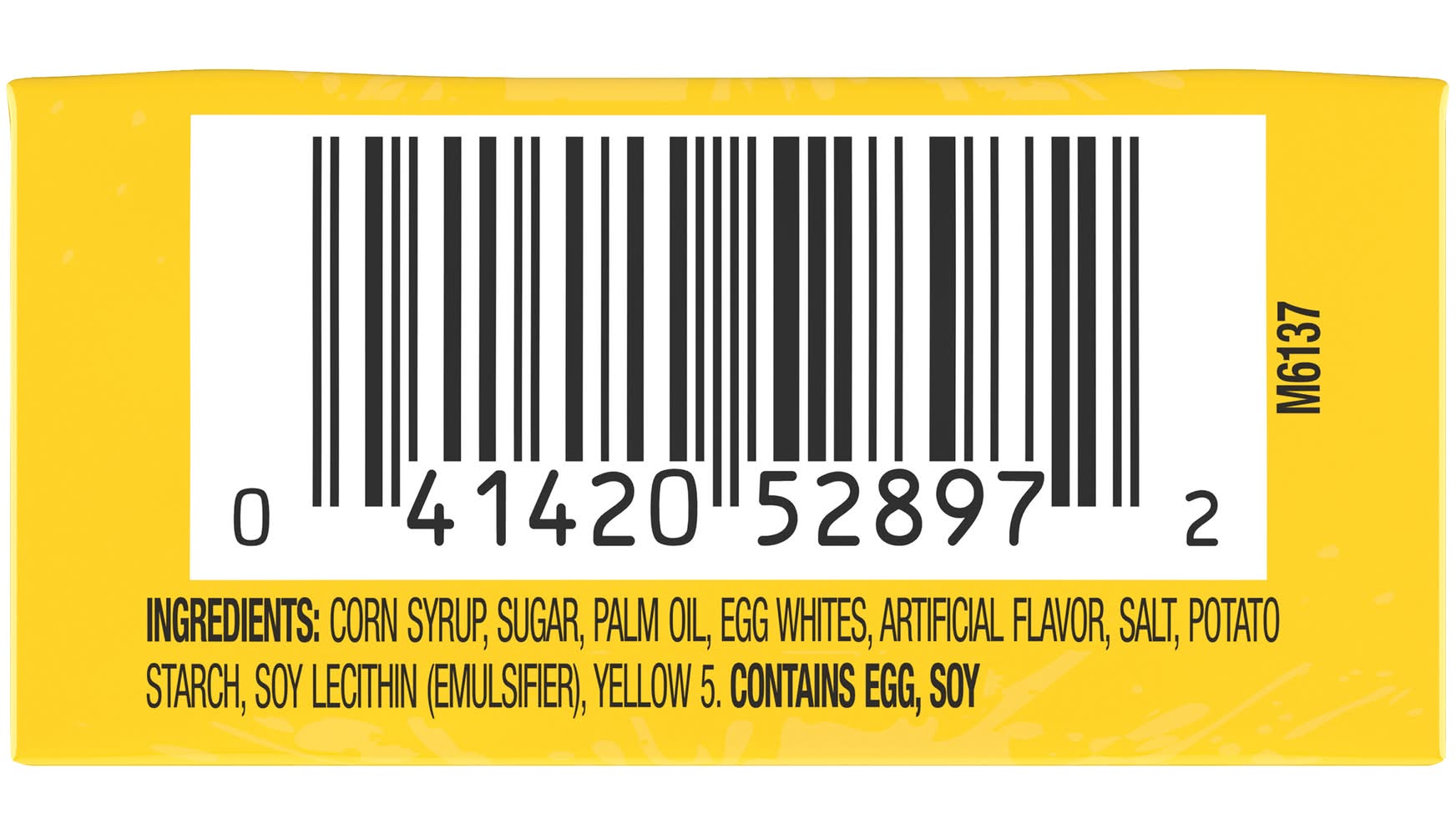 Ingredients: Corn Syrup, Sugar, Palm Oil, Egg Whites, Artificial Flavor, Salt, Potato Starch, Soy Lecithin (Emulsifier), Yellow 5 Contains: Eggs and their derivates, Soybean and its Derivatives