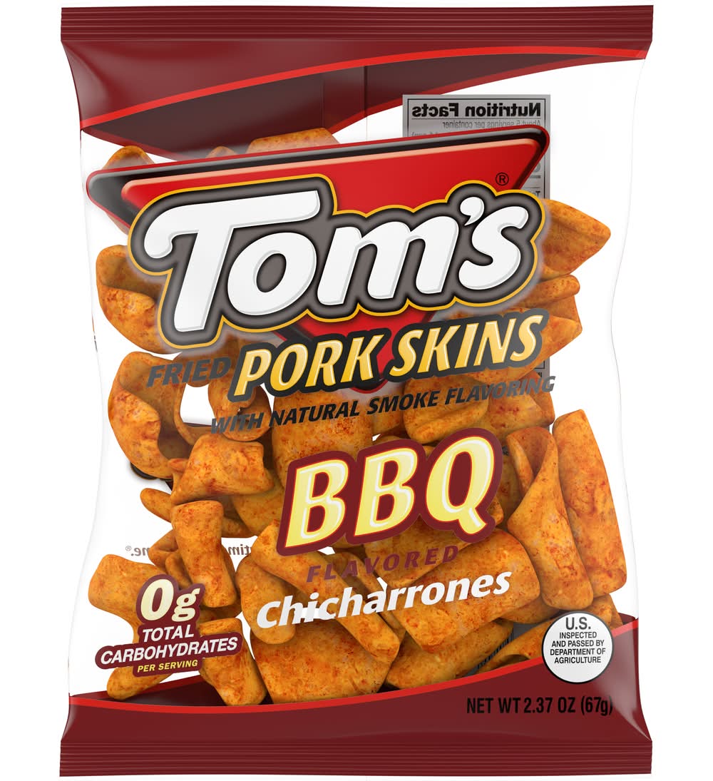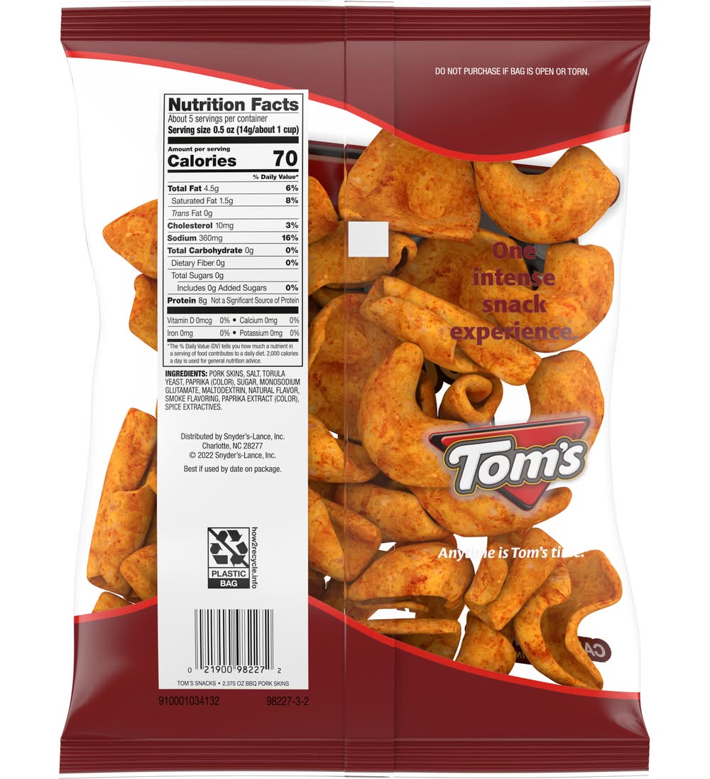 Tom's BBQ Flavored Pork Skins Chicharrones are a delicious treat that packs a delicious barbecue flavor with a powerful crunch. These classic pork skin snacks are perfect for those looking for a 0g carbohydrate snacking experience while taking care of all their salty cravings. Anytime is Tom's time. • Synder's-Lance, Inc., Charlotte, NC 28277 • Packaging: Reusable