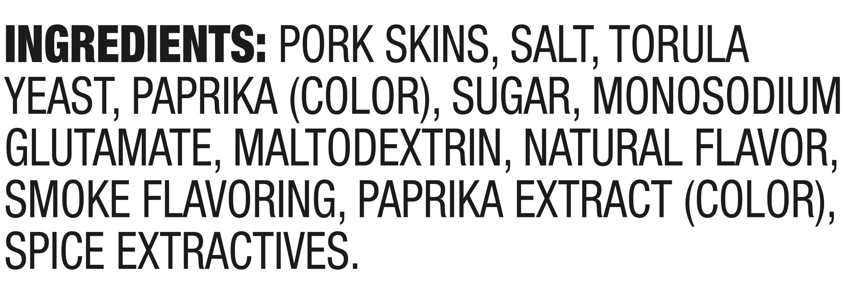 Ingredients: INGREDIENTS: PORK SKINS, SALT, TORULA YEAST, PAPRIKA (COLOR), SUGAR, MONOSODIUM GLUTAMATE, MALTODEXTRIN, NATURAL FLAVOR, SMOKE FLAVORING, PAPRIKA EXTRACT (COLOR), SPICE EXTRACTIVES.