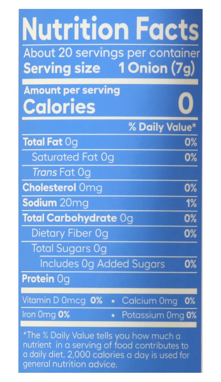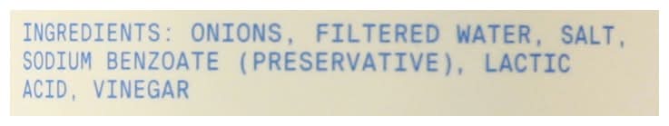 Ingredients: Onions, Filtered Water, Salt, Sodium Benzoate (Preservative), Lactic Acid, Vinegar Contains: 'Free From Gluten'