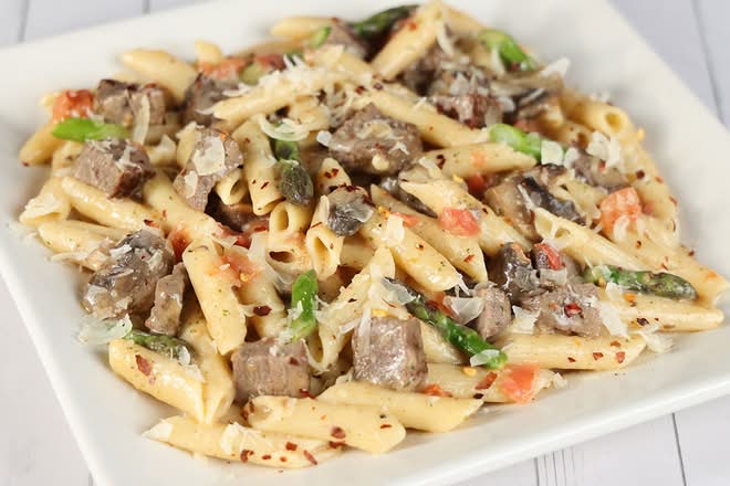 Tender steak mixed with alfredo sauce, tomatoes, chopped asparagus, sliced mushrooms, garlic butter, and tasty penne. Sprinkled with shaved parmesan cheese and red pepper flakes.