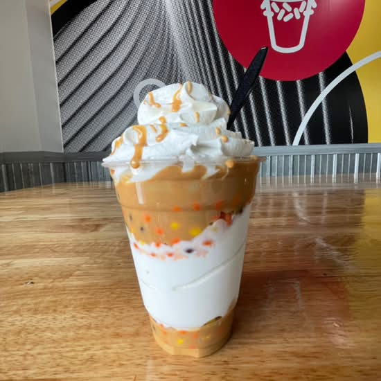 Vanilla ice cream, Reese's Pieces, peanut butter sauce, whipped cream