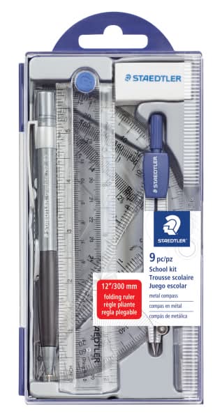 Perform geometric functions with the help of the tools in this kit. This set features 9 essential pieces for your math class in a flip-open storage box. Contains the necessary tools for a geometry class. Comes with a metal compass, automatic pencil, 6" 180° protractor, 12" folding ruler, 45° triangle, 60° triangle, extra lead and white eraser. Flip-open storage box for simple organization. Kit contains 8 essentail tools plus storage box.