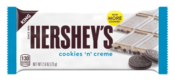 Snack with a friend on the Hershey's Cookies 'N' Creme King Bar. Filled with chocolate cookie bites, this candy bar helps satisfy your craving for something sweet. Made with white crème and chocolate cookie bites. Sealed for freshness and simple serving. King size makes it easy to share.