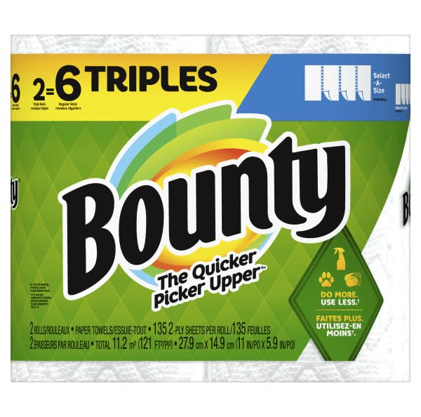 Reach for Bounty Select-A-Size 2-Ply Triple-Roll Paper Towels when you need to quickly clean up a spill. The paper towels are super absorbent, and the Select-A-Size design means you can grab as much or as little as you need. Absorbent design helps make quick work of messes. Select-A-Size rolls let you choose your sheet size based on the size of your mess. 2-pack to have extra on hand. • Color: White • Packaging: Reusable