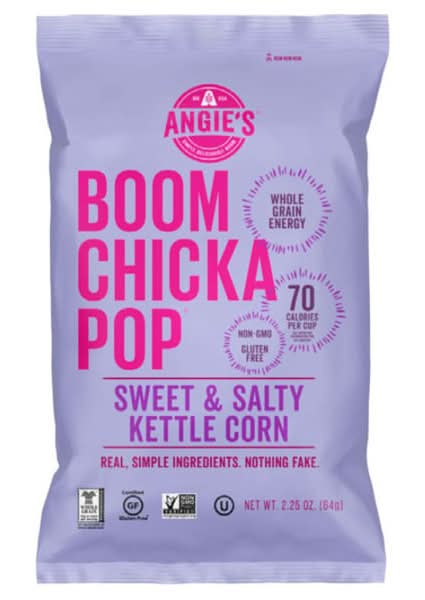 Snack smart with Angie's BOOMCHIKAPOP kettle corn. Each bite is big on flavor and low in calories. Seasoned kettle corn offers a sweet and savory flavor. Each 1-cup serving contains just 70 calories. Packaging: Reusable