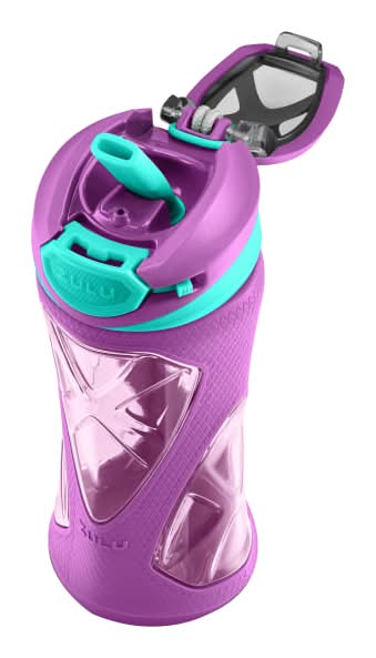 With a compact, easy-to-carry design, this water bottle is a great fit for your child's lunch box or bag. The sturdy Tritan plastic makes sure that accidental drops and impacts won't be a problem. Made of rugged Tritan plastic with a silicone sleeve for added protection. 1-touch push-button top includes a soft straw for easy hydration. Contains no BPA, PVC or phthalates for added peace of mind. Can be washed in the top rack of the dishwasher. Do not microwave or freeze. Reusable & avoids disposables - designed to be used repeatedly, helping you avoid single-use disposables and potentially save money. Color: Purple