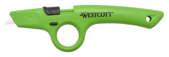 Open boxes with the Westcott SafeEdge Finger Loop Ceramic Safety Cutter. The cutter is auto retractable and includes a lock-out button for safety, and it features an ambidextrous finger slide for top and side use. Auto retractable with lock-out button for safety. Durable ceramic blades. ABS frame offers high impact durability. Rounded tip ensures safe usage. Finger loop provides extra control. Ambidextrous finger slide allows for top and side use. Backed by the manufacturer’s limited warranty. Color: Green