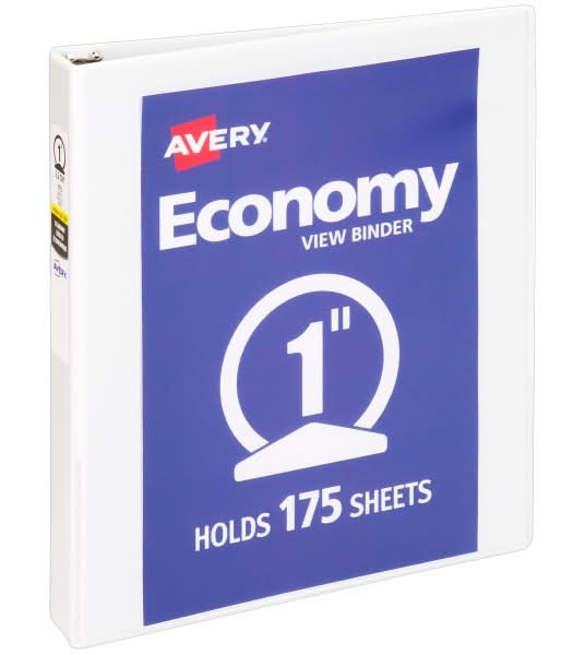 Keep your busy life on track and your paperwork organized like a pro with an Avery Economy Binder. The sturdy, lightweight construction ensures that the 3 ring binder is up for light, general use and is perfect for students, offices, and personal organization. Show off your class notes, employee handbooks and other important papers in a lower cost binder that provides a high-quality look and feel. Provides a simple and lightweight means of organizing papers. Deep texture film offers smooth finish and linen pattern for high-quality look and feel. Pages lie flat and turn easily in the 3 ring binder with back mounted round rings that hold sheets securely. Two interior pockets provide easy access to unbound papers. Important documents stay neat and clean in your durable binder with the nonstick PVC-free material that won't lift or transfer ink. Economy view binder allows for customization on spine, front and back covers so you can organize school subjects, kids activities, student paperwork, home office and more. UL Claim Validation - UL environmental claim validations lend third-party credibility to single-attribute environmental claims. Contains Recycled Content - See Specs for Details. • Color: White • Packaging: Reusable