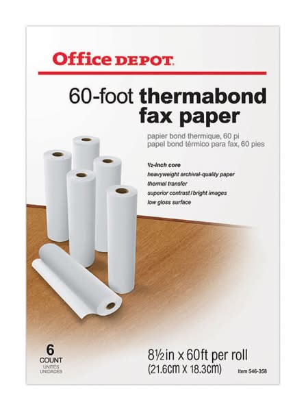 Your business day will run smoothly when you use Office Depot Brand fax paper in your fax machine. In addition to providing crisp details, the low-gloss finish of this Thermabond fax paper allows you to write on it with pen, pencil or marker. Low-gloss surface accepts pen, pencil or marker. Paper lets you write on received faxes just like ordinary paper, without skipping or smudging. You can re-fax it, you can copy it, you can file it. Heavyweight paper won't curl. Holds up in your fax machine. Never jams or bunches. Designed for fax machines with heavy-duty cutting bar or with no cutting bar. Superior thermal coating delivers excellent images. Extra-high-sensitivity thermal coating produces dark, black images. Fax paper comes in a box of 6 rolls. • Pack size: 6 • Color: White