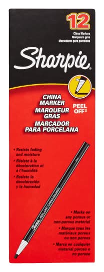 Write smoothly on porous and non-porous surfaces, including porcelain, glass, metal and plastic, with these easy to use, soft wax red Sharpie Peel-Off China Markers. Writing shows up clearly and brightly on metal, glass and polished surfaces with these versatile red wax-based china markers. No need to sharpen, simply pull the string and peel down to refresh the grease pencil tip. Easy and clean removal with a damp cloth. AP-certified non-toxic. Pack of 12 markers. ACMI Certified AP Nontoxic. For detailed information see www.acmiart.org. Less harsh chemicals - made with fewer harsh chemicals, or safer chemicals than typical alternatives, helping reduce your use of and exposure to substances that may be more harmful to your health and the environment. • Pack size: 12 • Color: Red