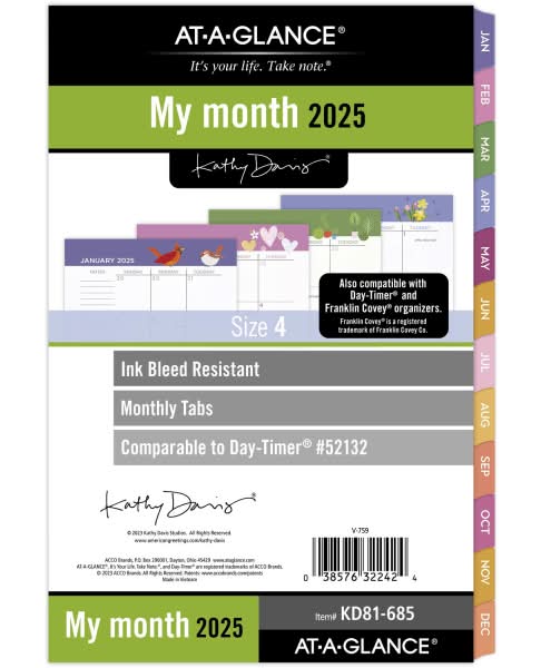 Manage your busy schedule by choosing the 2025 AT-A-GLANCE Kathy Davis Monthly Planner Refill to add to your 7-ring planner (sold separately). Artwork by Kathy Davis helps brighten your day, while the monthly spreads offer space for notes, unruled blocks for each day and calendars for reference. 2 pages per month. Unruled daily blocks, notes spaces and reference calendars on each spread to help you stay on track. 12 months: January to December. Monthly tabs to quickly turn to the right page. High-quality paper to resist ink bleed. Colorful artwork from Kathy Davis to inspire success. Pre-punched to fit in your 7-ring planner (sold separately). Comparable to Day-Timer item 52132. Color: White
