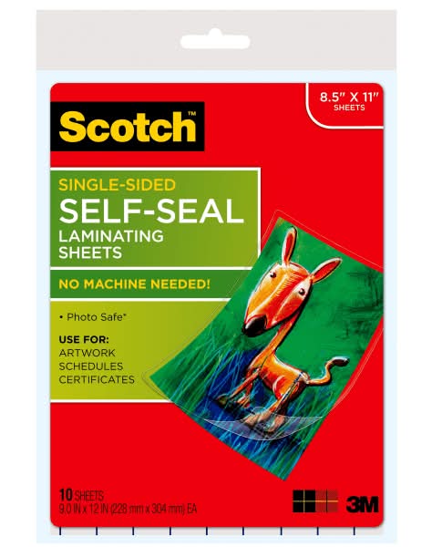Scotch® Self Sealing Laminating Sheets provide instant, permanent document laminating without heat or hassle. Protects and adds professionalism to business documents. Great for signs, flyers, schedules, certificates, to-do lists, and other frequently used documents. Easy to use...no special tools or equipment needed. Ultra clear to let important information show through. Ideal for marker-proof, tear-proof and spill-proof paper items that you want to last in the home, office or classroom. Letter Size, for items up to 8.5 in. x 11 in. 10 pack. Letter Size, for items up to 9 in x 12 in 10 PK Instant and permanent laminating without heat or hassle, no machine needed Easy to use with no special tools or equipment needed Ideal for protecting items from damage Delivers a clear professional finish that is also photo-safe Great for signs, flyers, schedules, certificates, and other frequently used documents in the home, office or classroom Ultra clear finish to let important information show through Ideal for marker-proof, tear-proof and spill-proof paper items that you want to last