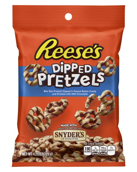 Reese's and Snyder's of Hanover has teamed up to create the perfect dipped pretzel experience. Grab some now for those afternoon snack cravings! Bite-size pretzels dipped in peanut butter candy and drizzled with milk chocolate. The perfect balance of sweet and salty. This snack is perfect for any time of day.