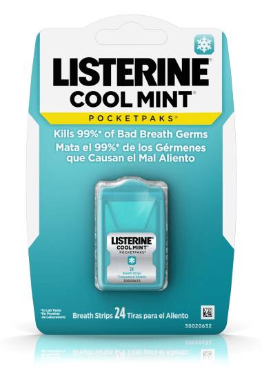 Refresh your bad breath with LISTERINE® COOL MINT® POCKETPAKS® Breath Strips. These mint breath strips dissolve instantly, killing 99 percent of germs that cause bad breath.* Slip your pack into your purse or pocket, so you can easily get fresh breath and kill bad breath germs after your morning coffee, or before an important meeting or date. *In laboratory tests. LISTERINE COOL MINT POCKETPAKS Breath Strips kill bad breath germs effectively Mint breath strips kill 99 percent of germs that cause bad breath, according to laboratory tests, and leave you with fresh breath for important occasions and meetings These COOL MINT flavored pocket-sized breath strips dissolve instantly to kill germs that cause bad breath while leaving your mouth feeling clean and refreshed Get bad breath germ protection on the go with these mint breath strips that are meant for easy-access fresh breath and to kill bad breath germs while you’re anywhere Discover fresh breath in one convenient step that kills bad breath germs quickly with a portable pack of mint breath strips Essential for your fully stocked breakroom or supply closet Refreshing cool mint flavor. Portable pack contains 24 Cool Mint Breath Strips Color: Blue