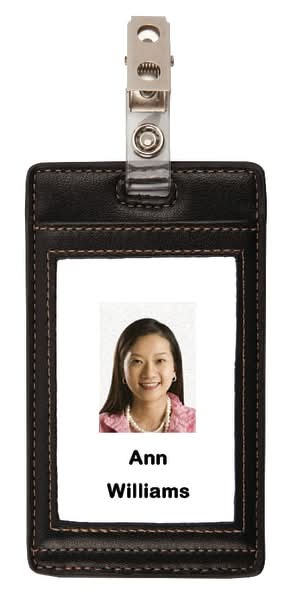 Carry your ID badge and business cards together! Top-loading design features a clip to keep your cards handy at all times. Holds cards up to 3 1/2" x 2 1/4". Credit or business card holder on back side. Faux Leather is a synthetic material. See specs for details. Color: Black