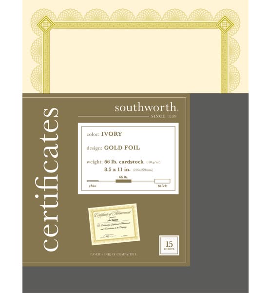 Recognize excellence in any setting with Southworth Foil Enhanced Certificates! Each certificate in this 15-pack is cut from 66-pound, acid-free cardstock to remain bright and durable over time. These Southworth bordered certificates are compatible with inkjet and laser printers, making them perfect for individualized messages or bulk printing. Southworth Certificates are ideal to commemorate your greatest achievements Distinctive border design for stand out awards. 25 sheets of certificate paper per package for plenty of awards to go around. Compatible with inkjet and laser printers, so you can achieve a professional look. Lignin and acid-free paper to resist yellowing and disintegration. Pair with Southworth foil seals and certificate holders for a complete look. Blank certificates with Ivory color and gold foil design Paper weight: 66 lbs. Color: Multicolor