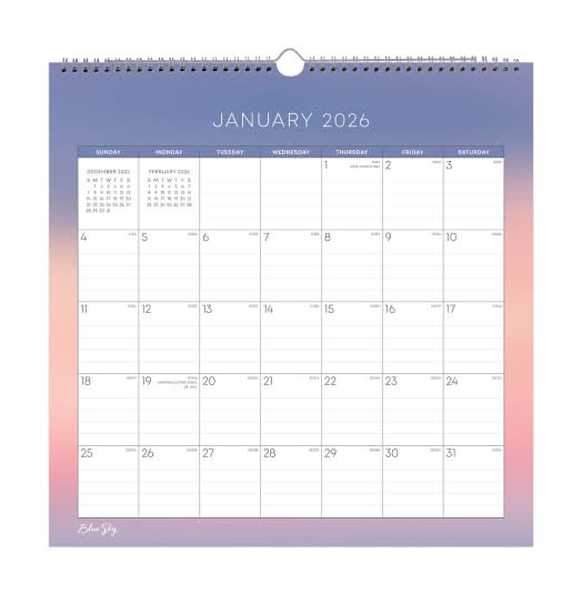 Brighten up your home or office with the 2026 Blue Sky Monthly Wall Calendar. Monthly spreads highlight major holidays to plan around and feature reference calendars for quick date checking as you schedule appointments. Monthly spreads feature reference calendars for quick date checking. Notes major holidays. Covers 12 months: January to December. Stapled pages withstand year-long use. Color: White