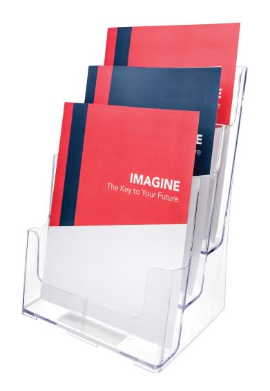 Literature holders are great tabletop displays for restaurant menus, bank signs, Hotel concierge desks, Hotel registration desks, or any company marketing material. Made of clear durable plastic. Great for booklets, or brochures. Color: Clear
