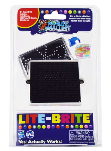 Take a break at work with the Super Impulse World’s Smallest Lite Brite Game. The light box and unique colored pegs create fun colorful images, while the compact size offers easy storage. Light box and colored pegs create unique colorful images. Compact size allows for convenient storage. Includes 150 colored pegs and 15 design templates. Packaging: Reusable