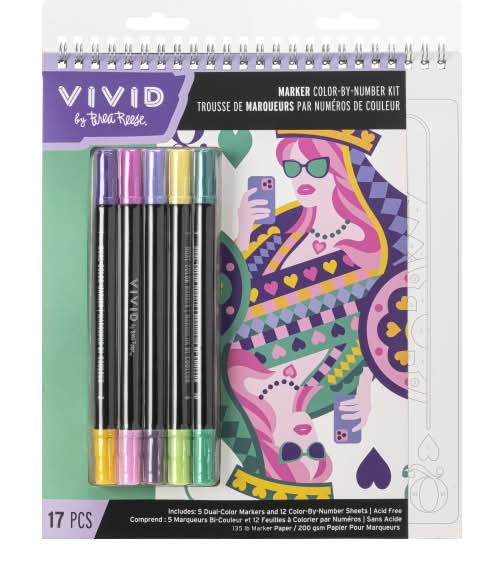 Show off your artistic side with this Vivid by Brea Reese Queen of Hearts Color-by-Number Marker Notepad. The included thick, smooth marker paper helps to prevent bleed-through for clean results. Includes 12 sheets and 5 dual-color markers. Thick, smooth marker paper helps to prevent bleed-through. Great for blending and layering with markers. Paint-by-number format is ideal for beginners and experienced crafters alike. Fun heart-inspired theme.