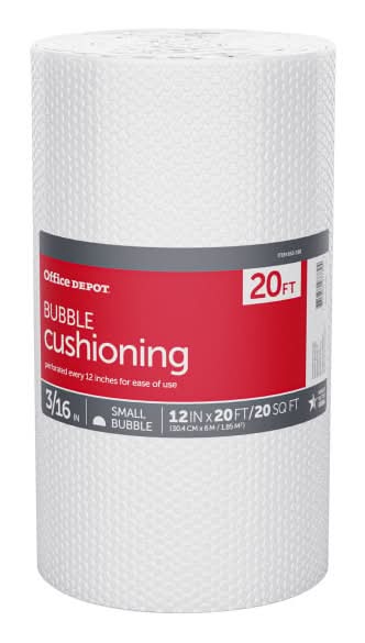 Your good reputation demands that customers receive shipments in perfect condition. Cushion items in shipping cartons with this Office Depot bubble roll, and simply tear off as much as you need. Great for most shipping, mailing and storage applications. Thick bubble roll helps protect and secure valuable items and prevent breaking. Perforated for easy use. This Office Depot bubble roll measures 3/16" thick to provide cushioned protection for items in transit. Clear bubble roll measures 12" x 20'. Color: Clear