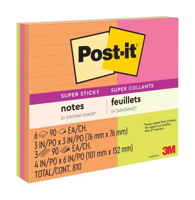 Post-it® Super Sticky Notes, 9 Pads, 90 Sheets/Pad, Lined and Unlined, Assorted Sizes, Energy Boost Collection