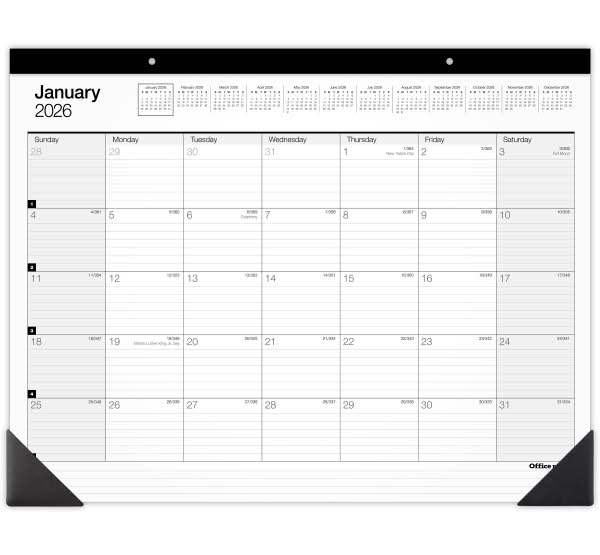 Many in stockThe Office Depot Brand Desk Pad Calendar makes it easy to keep your busy schedule organized. Simply place the calendar on your desktop and jot down new appointments or notes as you work. Covers 12 months from January 2026 - December 2026 for yearly planning Monthly pages have ruled daily blocks Each page has a full year of reference calendars for quick date checking Top headband has two eyelets for optional wall hanging Black corner protectors help prevent pages from curling Pages are perforated for easy removal. Pages measure 21 3/4" x 17". Color: White