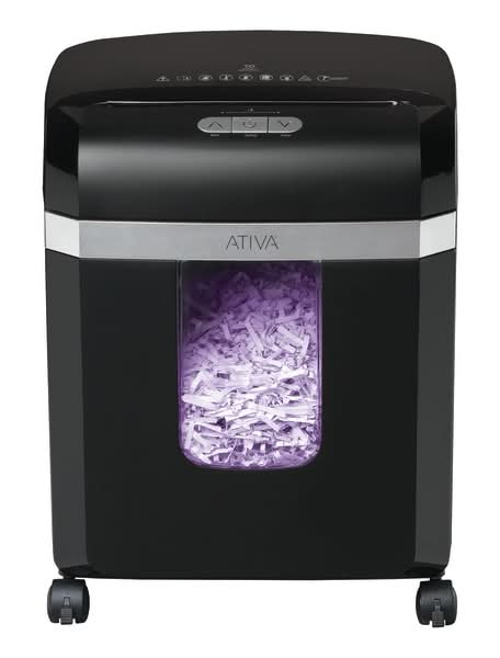 Destroying sensitive documents can help ensure that your private information stays out of the hands of identity thieves and other criminals. This Ativa shredder in black and gray allows you to quickly dispose of financial statements and other personal papers, providing you with increased peace of mind. 10-sheet shredder can be used to destroy papers, credit cards, and staples. 3.4-gallon pullout bin has an easy-open lid. Destroys up to 10 sheets per pass, so you can finish large tasks more quickly. 10-sheet cross-cut shredder turns paper into 5mm x 18mm pieces to help keep sensitive information safe. 8-11/16" throat size can accommodate most documents. Covered blades and safety locks help prevent accidents and injuries. Starts automatically when paper is loaded and stops when the job is finished. Overheat protection stops work if the motor starts to get too hot. Operates continuously for up to 5 minutes before cool down is required. Backed by the manufacturer's 1-year limited warranty. Compatible with Ativa clear shredder bags (4 gallons), sold separately. Color: Assorted