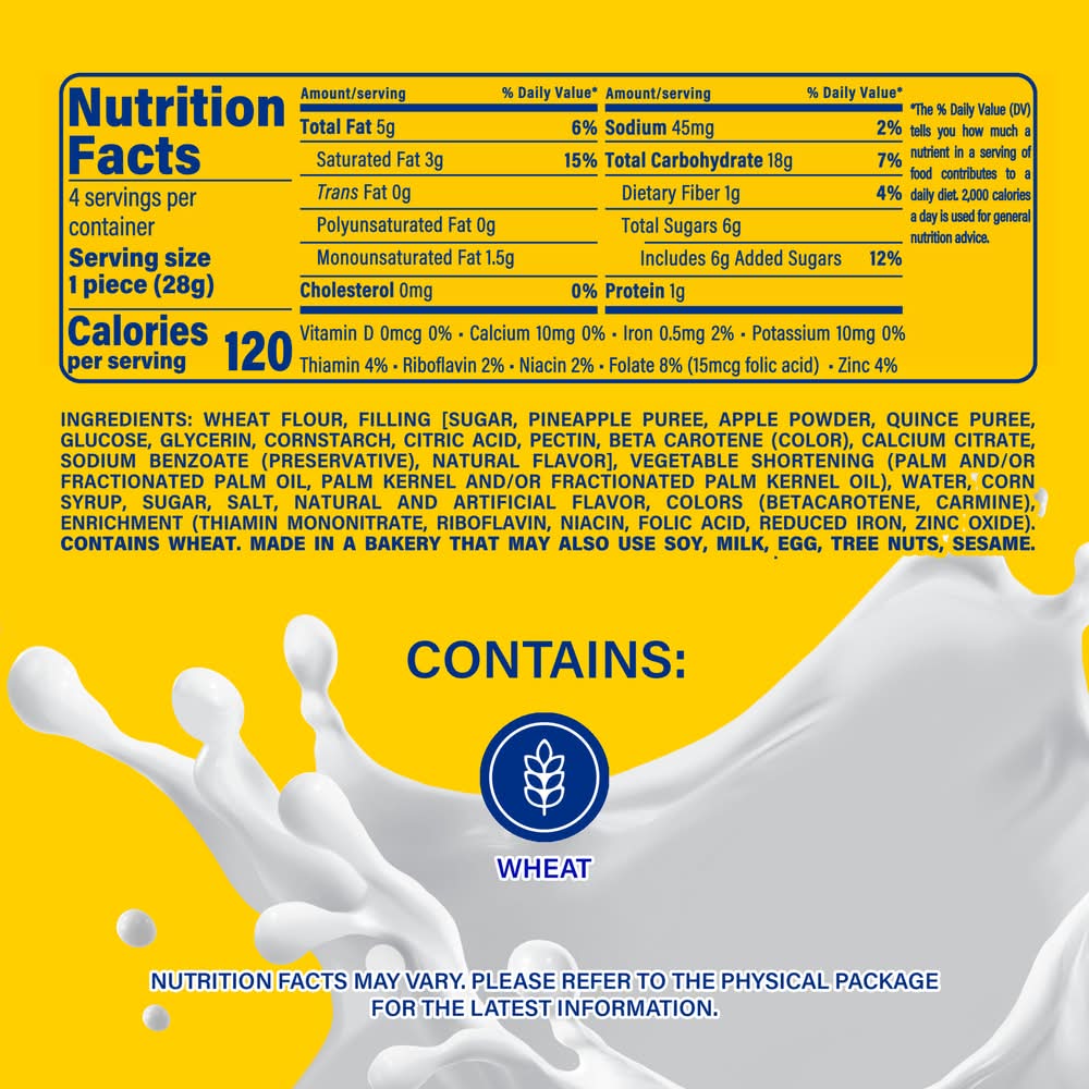 Ingredients: WHEAT FLOUR, FILLING [SUGAR, PINEAPPLE PUREE, APPLE POWDER, QUINCE PUREE, GLUCOSE, GLYCERIN, CORNSTARCH, CITRIC ACID, PECTIN, BETA CAROTNE (COLOR), CALCIUM CITRATE, SODIUM BENZOATE (PRESERVATIVE), NATURAL FLAVOR], VEGETABLE SHORTENING [PALM OIL, FRACTIONATED PALM OIL, PALM KERNEL OIL, FRACTIONATED PALM KERNEL OIL], WATER, CORN SYRUP, SUGAR, SALT, NATURAL AND ARTIFICIAL FLAVORS, COLORS [BETACAROTENE, CARMINE], ENRICHMENT [THIAMIN MONONITRATE, RIBOFLAVIN, NIACIN, FOLIC ACID, REDUCED IRON, ZINC OXIDE], . Contains: CONTAINS WHEAT.