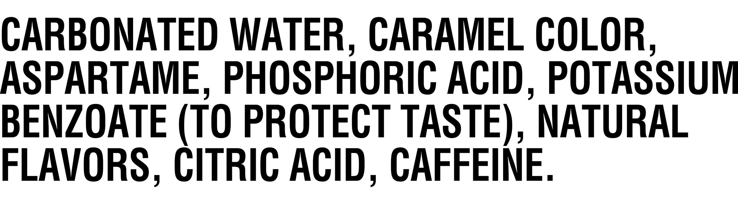 Ingredients: Carbonated Water, Caramel Color, Aspartame, Phosphoric Acid, Potassium Benzoate (To Protect Taste), Natural Flavors, Citric Acid, Caffeine.