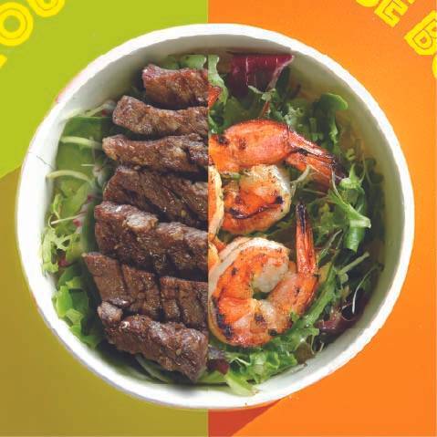 Choose two proteins with rice, noodles, or greens, and top with a variety of savory sauces.