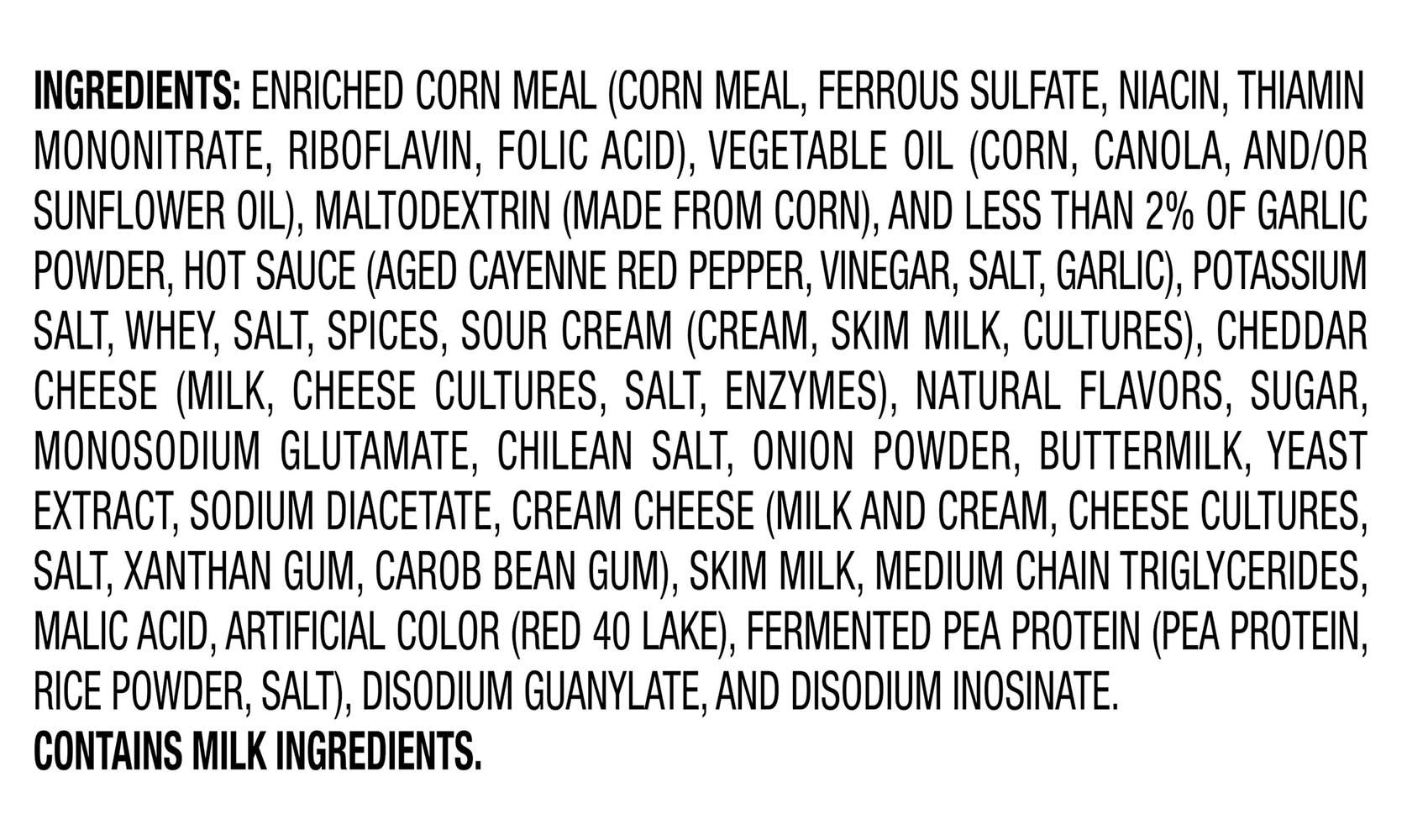 Ingredients: Enriched Corn Meal (Corn Meal, Ferrous Sulfate, Niacin, Thiamin Mononitrate, Riboflavin, Folic Acid), Vegetable Oil (Corn, Canola, and/or Sunflower Oil), Maltodextrin (Made from Corn), and Less than 2% of Garlic Powder, Hot Sauce (Aged Cayenne Red Pepper, Vinegar, Salt, Garlic), Potassium Salt, Whey, Salt, Spices, Sour Cream (Cream, Skim Milk, Cultures), Cheddar Cheese (Milk, Cheese Cultures, Salt, Enzymes), Natural Flavors, Sugar, Monosodium Glutamate, Chilean Salt, Onion Powder, Buttermilk, Yeast Extract, Sodium Diacetate, Cream Cheese (Milk and Cream, Cheese Cultures, Salt, Xanthan Gum, Carob Bean Gum), Skim Milk, Medium Chain Triglycerides, Malic Acid, Artificial Color (Red 40 Lake), Fermented Pea Protein (Pea Protein, Rice Powder, Salt), Disodium Guanylate, and Disodium Inosinate Contains: Milk, Corn