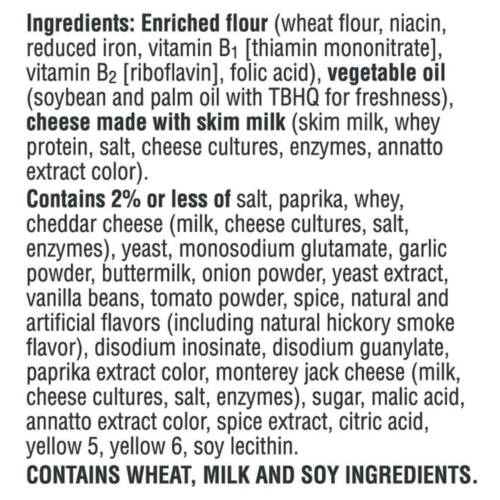 Ingredients: Enriched Flour (Wheat Flour, Niacin, Reduced Iron, Vitamin B1 [Thiamin Mononitrate], Vitamin B2 [Riboflavin], Folic Acid), Vegetable Oil (Soybean and Palm Oil with TBHQ for Freshness), Cheese Made with Skim Milk (Skim Milk, Whey Protein, Salt, Cheese Cultures, Enzymes, Annatto Extract Color), Contains 2% or Less of Salt, Paprika, Whey, Cheddar Cheese (Milk, Cheese Cultures, Salt, Enzymes), Yeast, Monosodium Glutamate, Garlic Powder, Buttermilk, Onion Powder, Yeast Extract, Vanilla Beans, Tomato Powder, Spice, Natural and Artificial Flavors (Including Natural Hickory Smoke Flavor), Disodium Inosinate, Disodium Guanylate, Paprika Extract Color, Monterey Jack Cheese (Milk Cheese Cultures, Salt, Enzymes), Sugar, Malic Acid, Annatto Extract Color, Spice Extract, Citric Acid, Yellow 5, Yellow 6, Soy Lecithin Contains: Wheat, Milk, Soybeans
