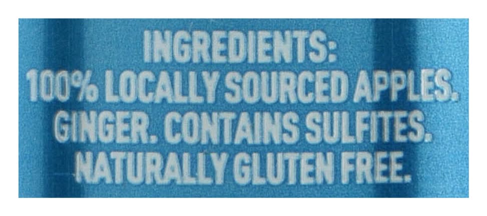 Ingredients: 100% Locally Sourced Apples, Ginger, Contains Sulfites, Naturally Gluten Free Contains: Sulfites