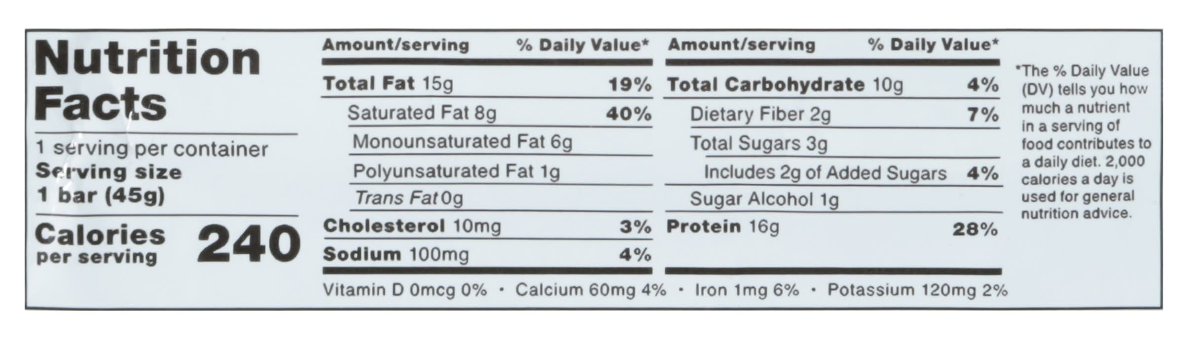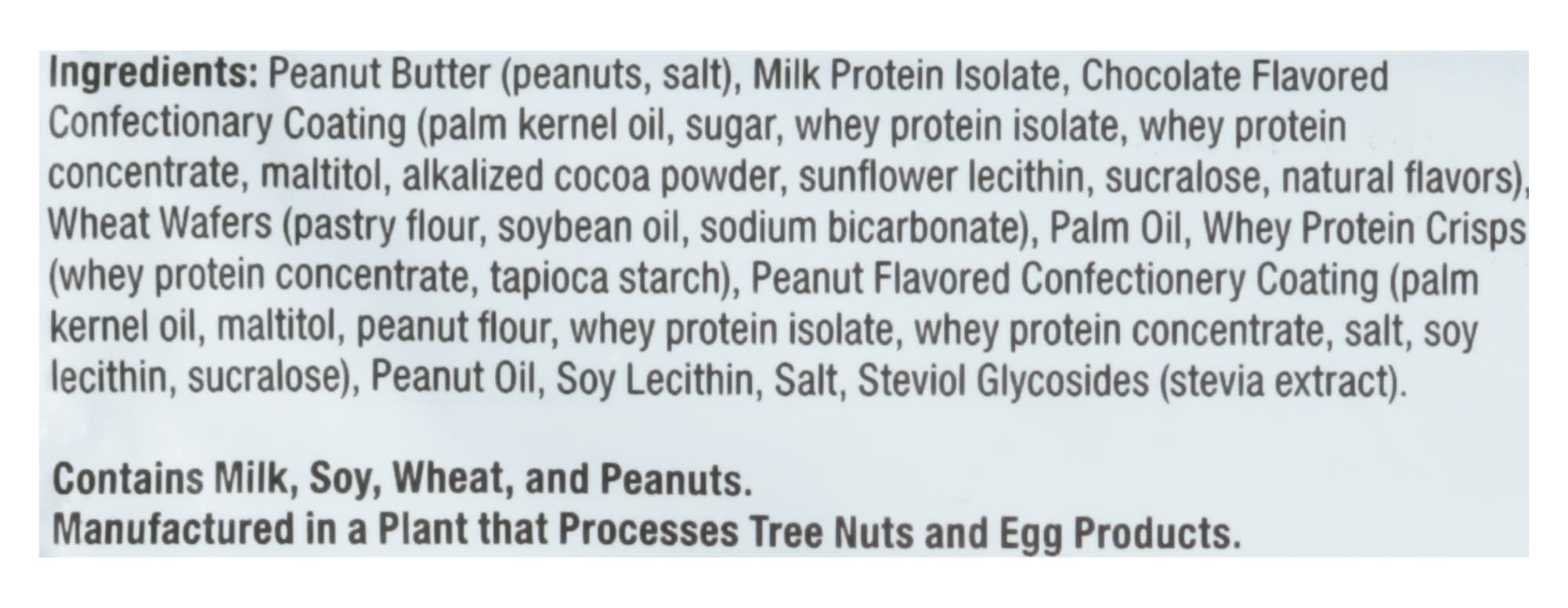 Ingredients: Peanut Butter (Peanuts, Salt), Milk Protein Isolate, Chocolate Flavored Confectionary Coating (Palm Kernel Oil, Sugar, Whey Protein Isolate, Whey Protein Concentrate, Maltitol, Alkalized Cocoa Powder, Sunflower Lecithin, Sucralose, Natural Flavors), Wheat Wafers (Pastry Flour, Soybean Oil, Sodium Bicarbonate), Palm Oil, Whey Protein Crisps (Whey Protein Concentrate, Tapioca Starch), Peanut Flavored Confectionery Coating (Palm Kernel Oil, Maltitol, Peanut Flour, Whey Protein Isolate, Whey Protein Concentrate, Salt, Soy Lecithin, Sucralose), Peanut Oil, Soy Lecithin, Salt, Steviol Glycosides (Stevia Extract) Contains: Milk, Soybeans, Wheat, Peanuts, Tree Nuts, Eggs
