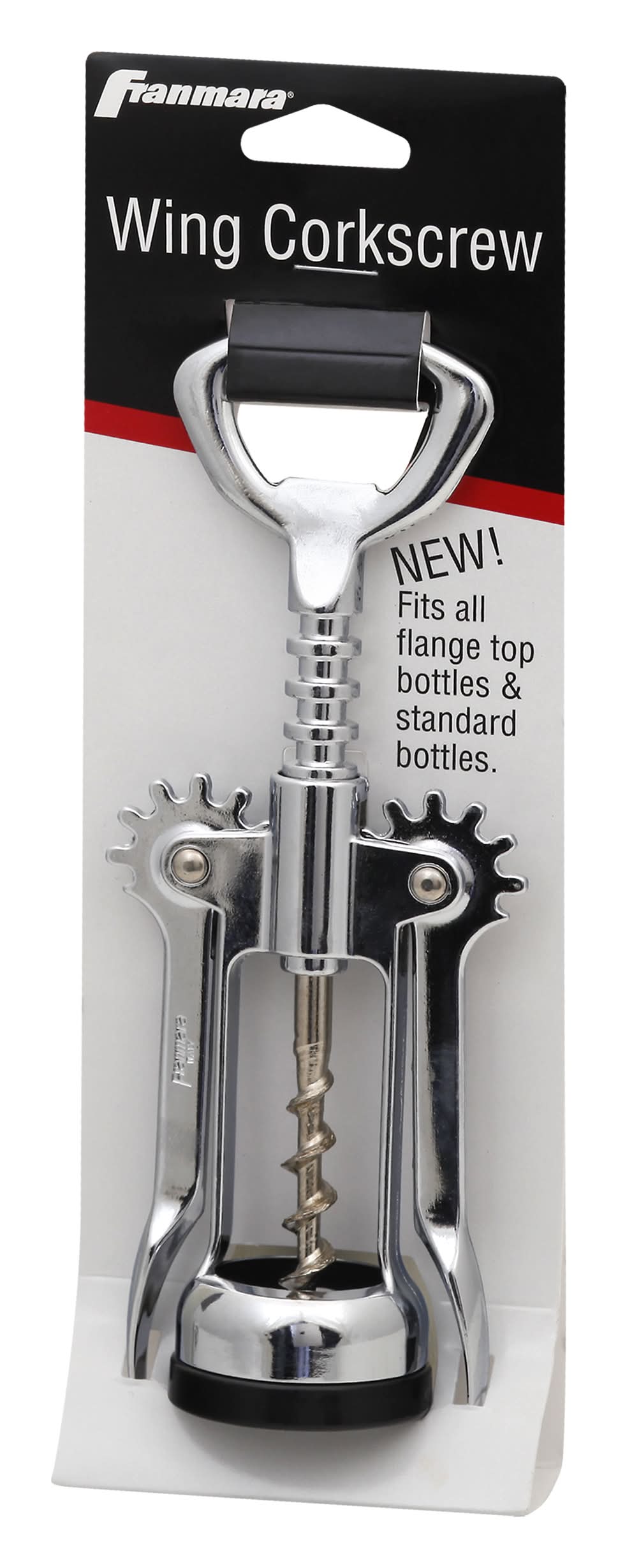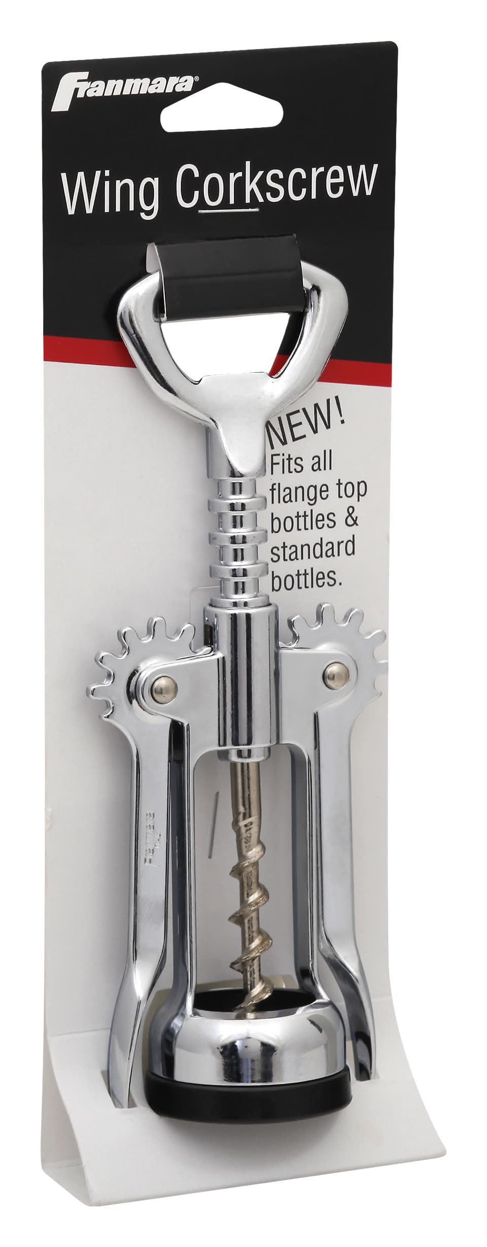 1. to remove cork from bottle, place corkscrew over cork and turn handle clockwise. both wings should be in the downward position. 2. as the worm goes deeper into cork, the wings will open upward. 3. when the worm is fully inserted into cork, press down on the wings. cork will easily lift out of bottle. top on corkscrew opens bottle caps.