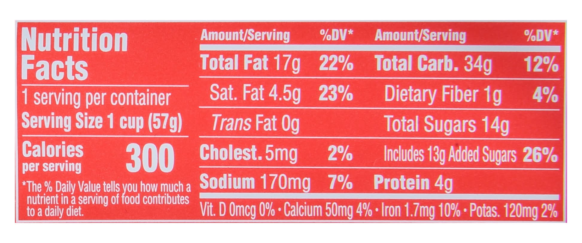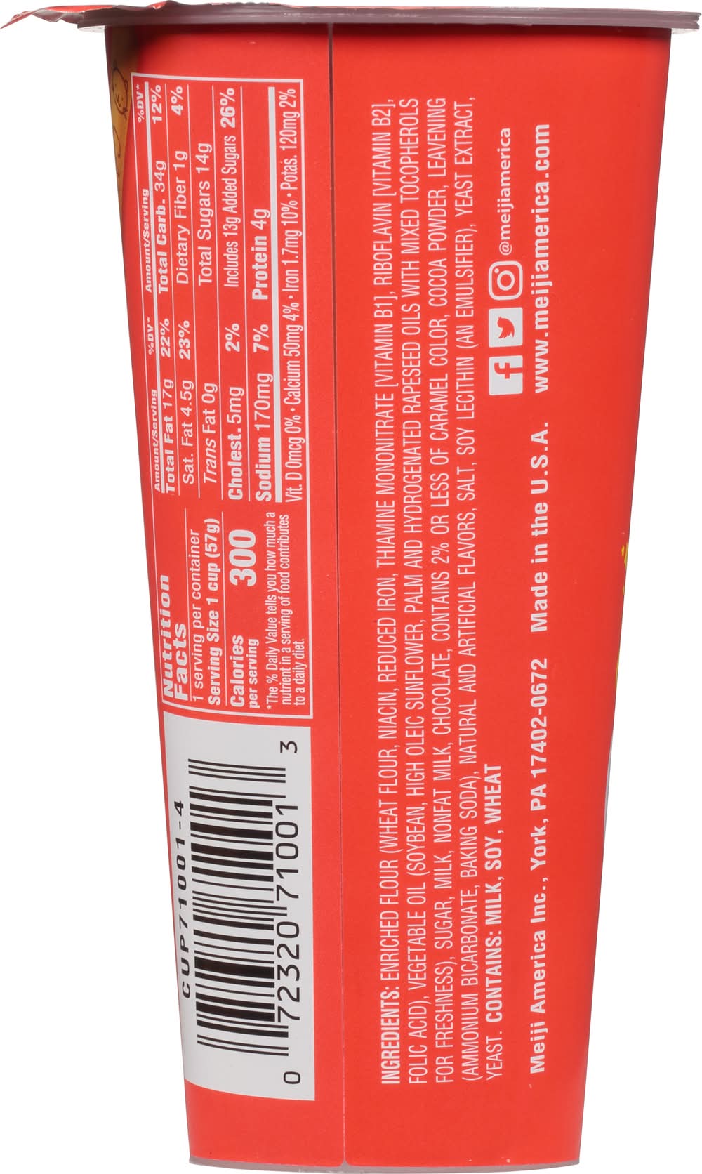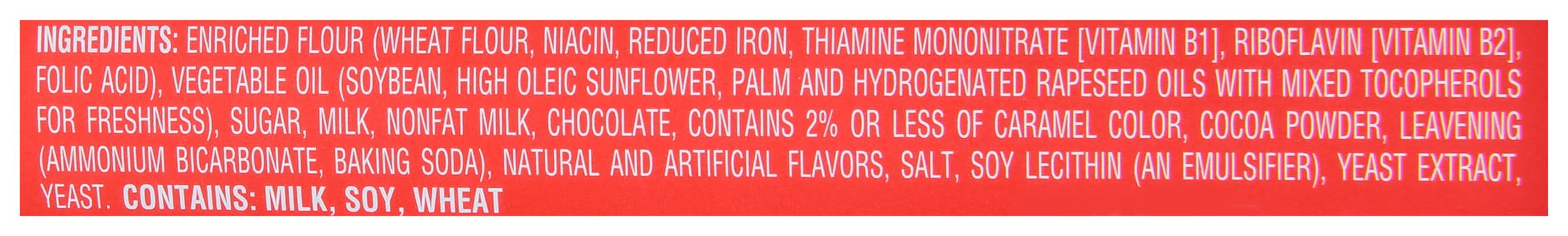 Ingredients: Enriched Flour (Wheat Flour, Niacin, Reduced Iron, Thiamine Mononitrate [Vitamin B1], Riboflavin [Vitamin B2], Folic Acid), Vegetable Oil (Soybean, High Oleic Sunflower, Palm and Hydrogenated Rapeseed Oils with Mixed Tocopherols for Freshness), Sugar, Milk, Nonfat Milk, Chocolate, Contains 2% or Less of Caramel Color, Cocoa Powder, Leavening (Ammonium Bicarbonate, Baking Soda), Natural and Artificial Flavors, Salt, Soy Lecithin (an Emulsifier), Yeast Extract, Yeast. Contains: Milk, Soybeans, Wheat