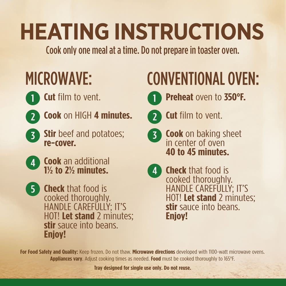 Directions for use: Must be cooked thoroughly. Microwave oven cook only one at a time. 1. Cut fin to vent. 2. Cook on high 4 minutes. stir beef and potatoes re-cover. (4) Cook an additional 1-1/2 to 2-1/2 minutes. (5) Check that food is cooked thoroughly. Handle carefully its hot!: Let stand 2 minutes, stir sauce into beans enjoy! Conventional Oven: Do not prepare in toaster oven. Preheat oven to 350 degrees F. Cut film to vent. Cook on baking sheet in center of oven 35 to 40 minutes. Check that food is cooked thoroughly. Handle carefully its hot! Let stand 2 minutes; stir sauce into beans. Enjoy! For Food Safety and Quality: Keep frozen. Do not thaw. Microwave directions developed with 100-walt microwave ovens. Appliances vary. Adjust cooking times as needed. Food must be cooked thoroughly to 165 degrees F. Keep frozen. Push to open. Storage recommendation: Keep frozen.