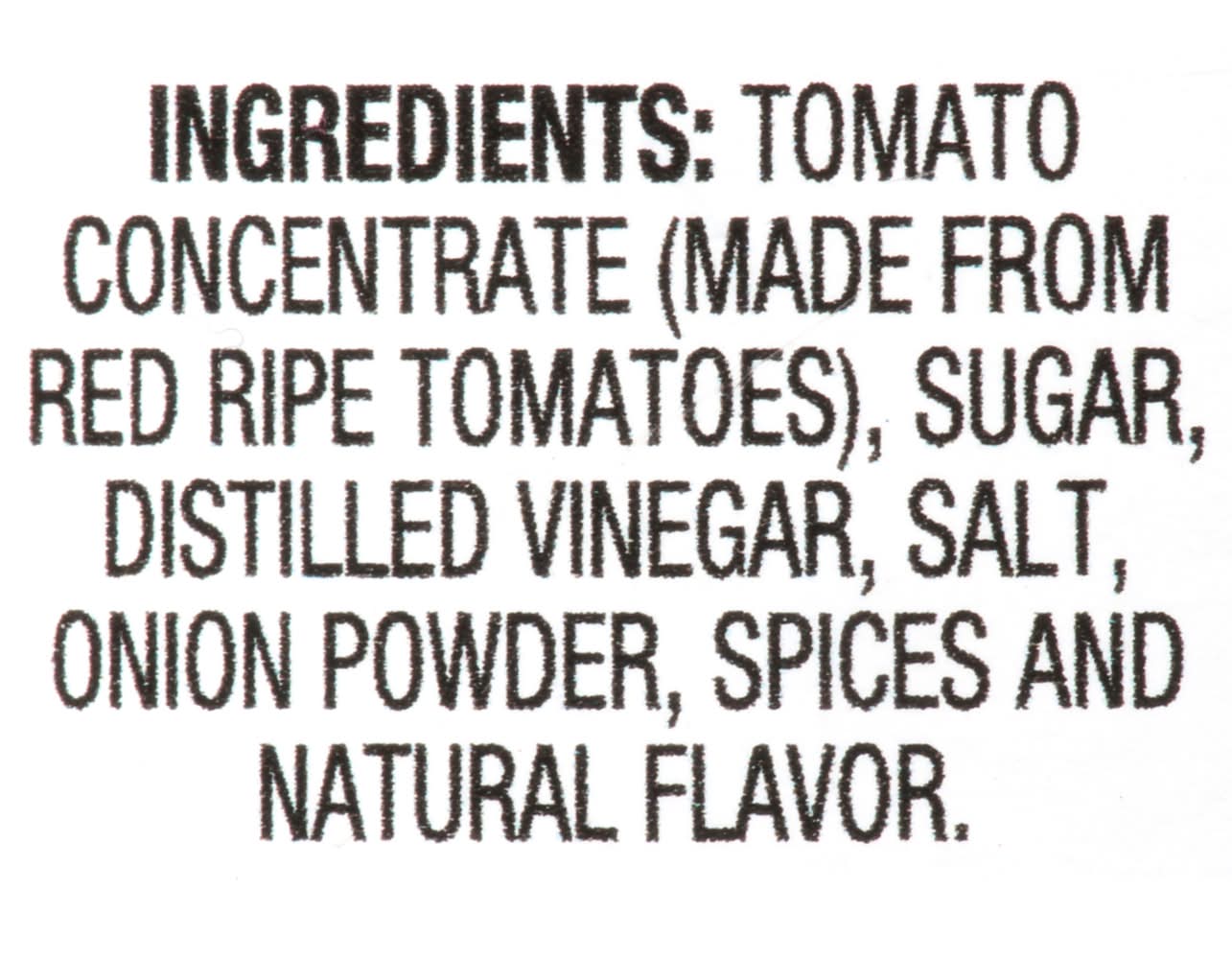Ingredients: Tomato Concentrate (Made from Red Ripe Tomatoes), Sugar, Distilled Vinegar, Salt, Onion Powder, Spices and Natural Flavor.