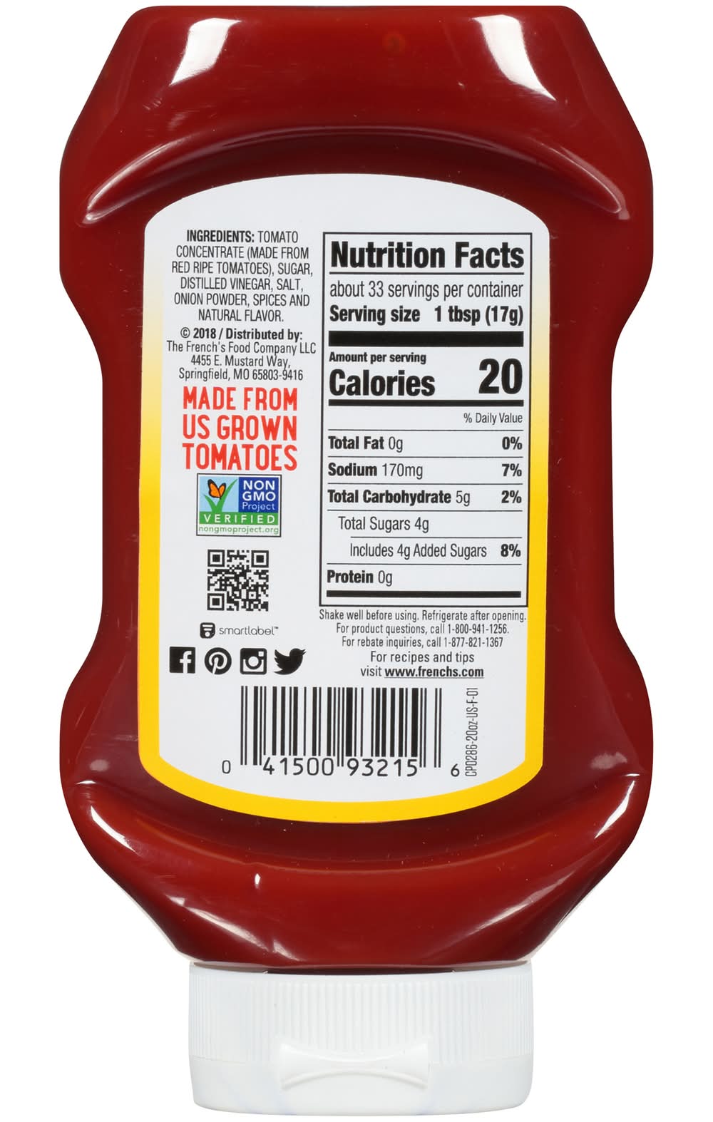 Up the flavor game at tailgates, barbeques, and the dinner table with French's® Tomato Ketchup. Made with quality ingredients—like tomatoes and spices—its sweet, signature taste will have you craving more. • Brand: French's • Number of servings: 33 • The French's Food Company LLC, Springfield, MO, 65803-9416, Ph: 877-821-1367