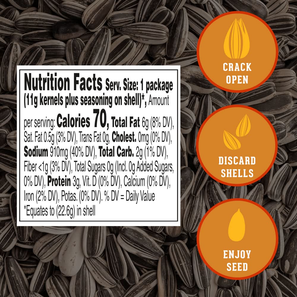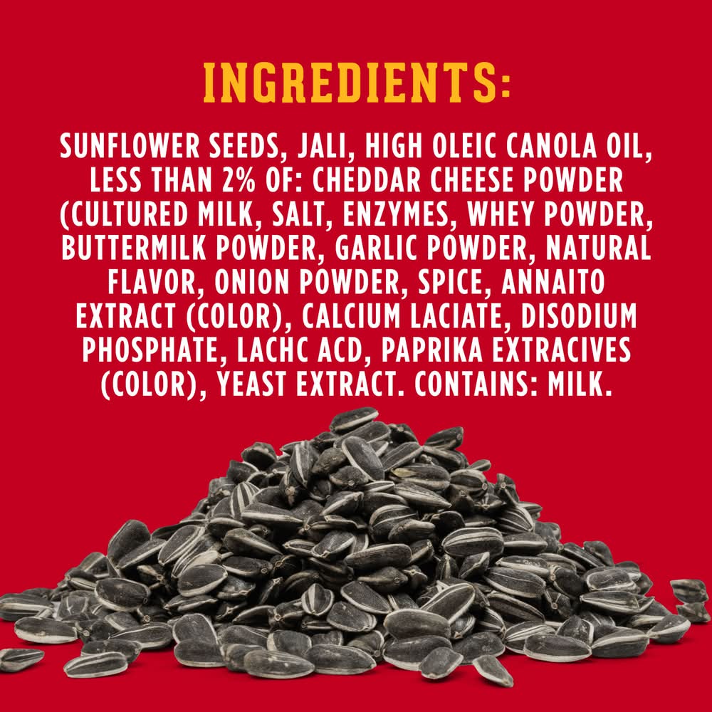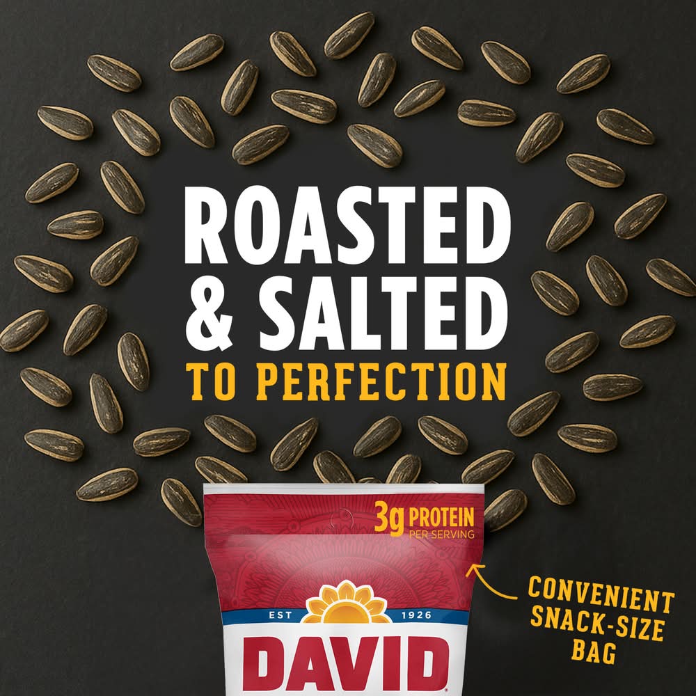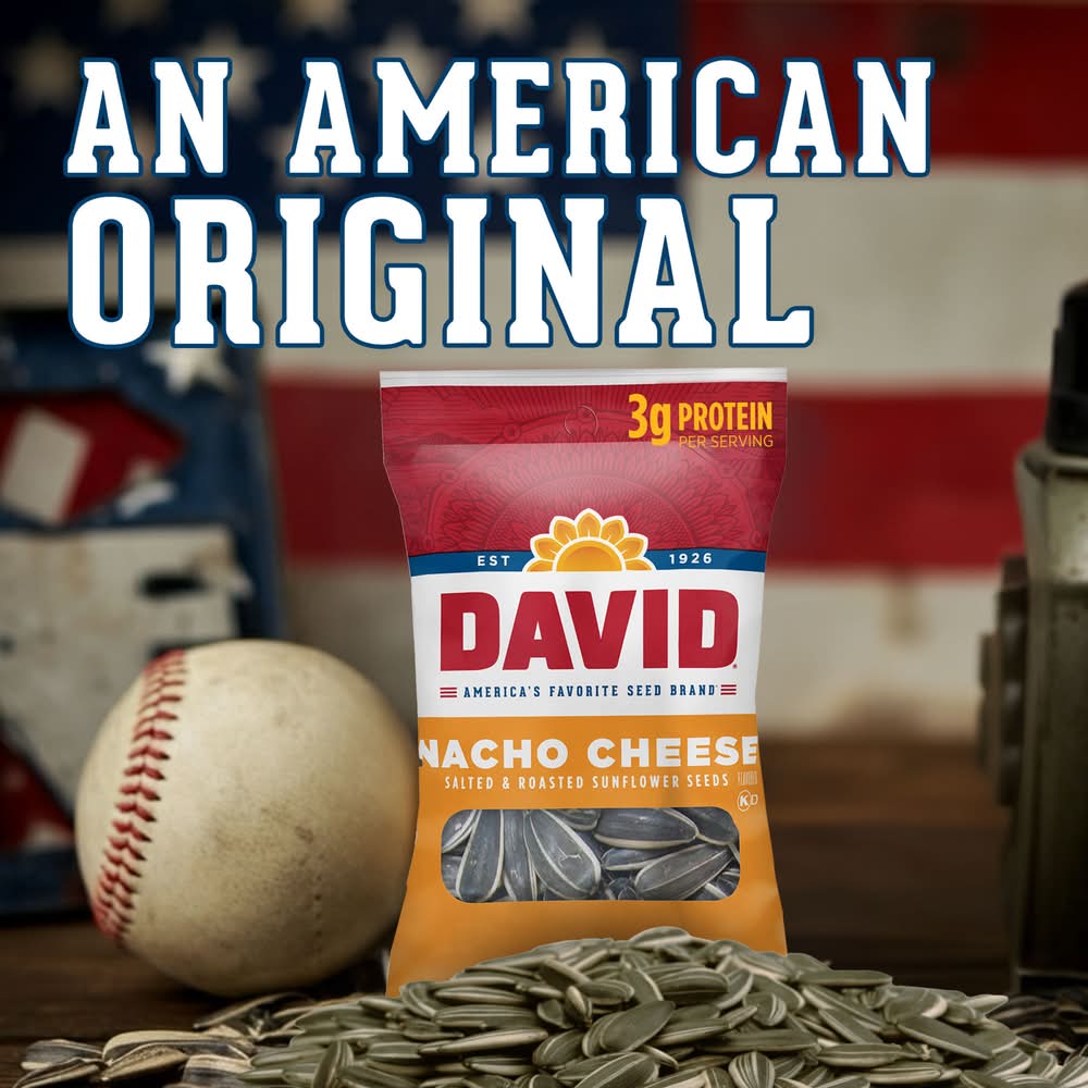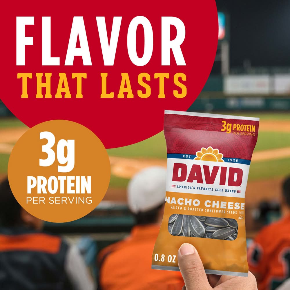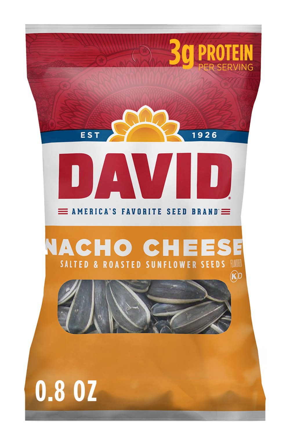 DAVID Nacho Cheese Naturally and Artificially Flavored Salted and Roasted Sunflower Seeds are delicious sunflower seeds that are fun to eat anytime, anywhere. These nacho sunflower seeds are full of that salted and roasted flavor you've come to expect with a nacho cheese flavoring for an extra kick of flavor. Crack open the shells, discard the shells and enjoy seeds! These classic sunflower seeds are gluten free, keto friendly (3g of protein, <2g net carbs [2g total carbs minus <1g dietary fiber], and 0g added sugar per serving) and fit a low carb lifestyle (<2g net carbs per serving [2g total carbs minus <1g dietary fiber]). DAVID sunflower seeds are fun and engaging salty snacks to enjoy. DAVID seeds can help with mental focus during the work day or while studying for a test, they can help athletes stay alert during baseball and softball games, and they can help pass the time during long road trips or while watching a sporting event. These salted and roasted sunflower seeds are packaged in a conveniently sized bag so you can take this snack with you wherever you go. DAVID is an American Original, salted and roasted sunflower seeds since 1926. They are delicious and fun to eat anytime, anywhere.