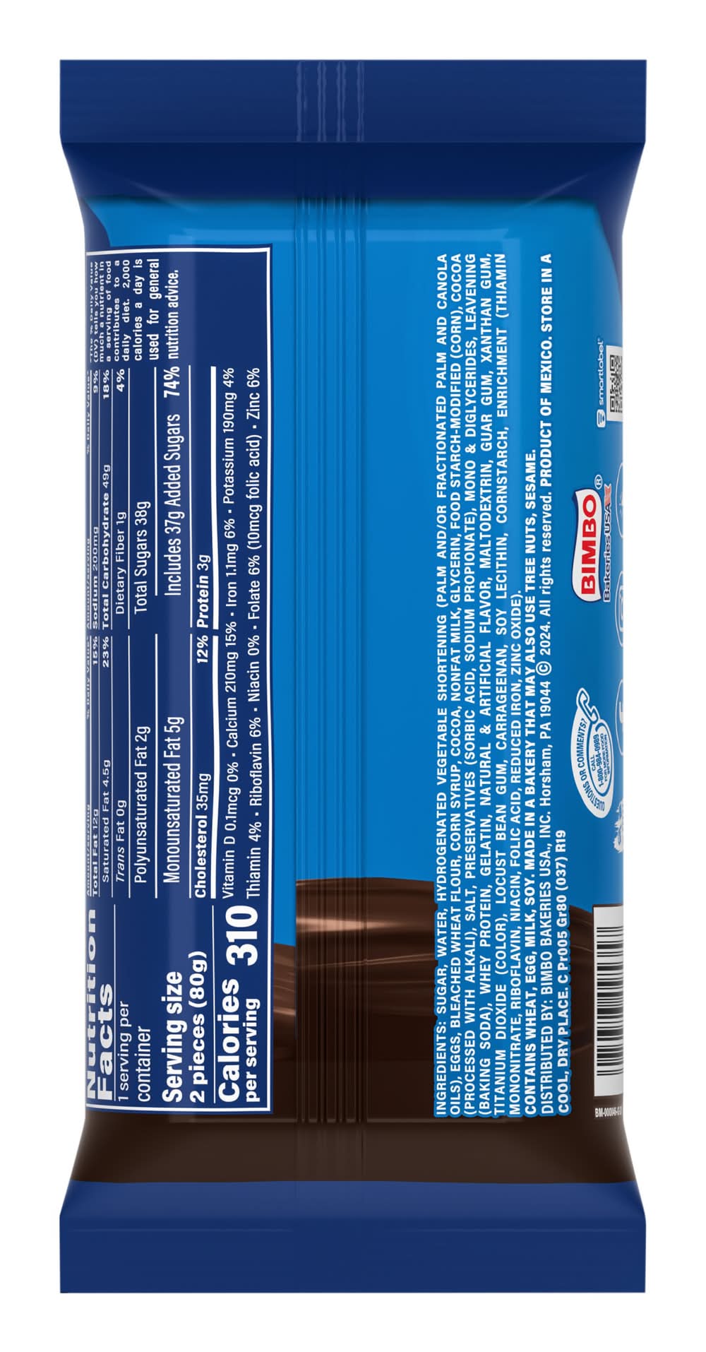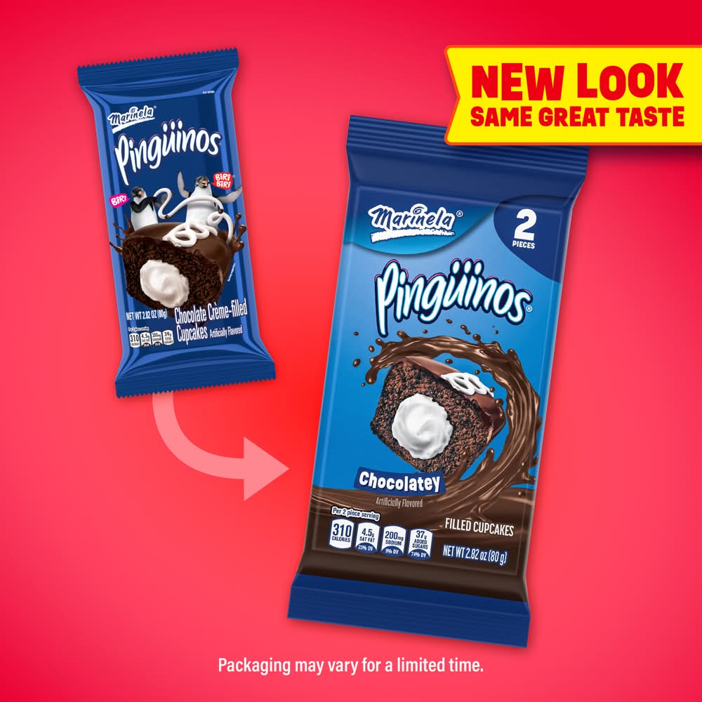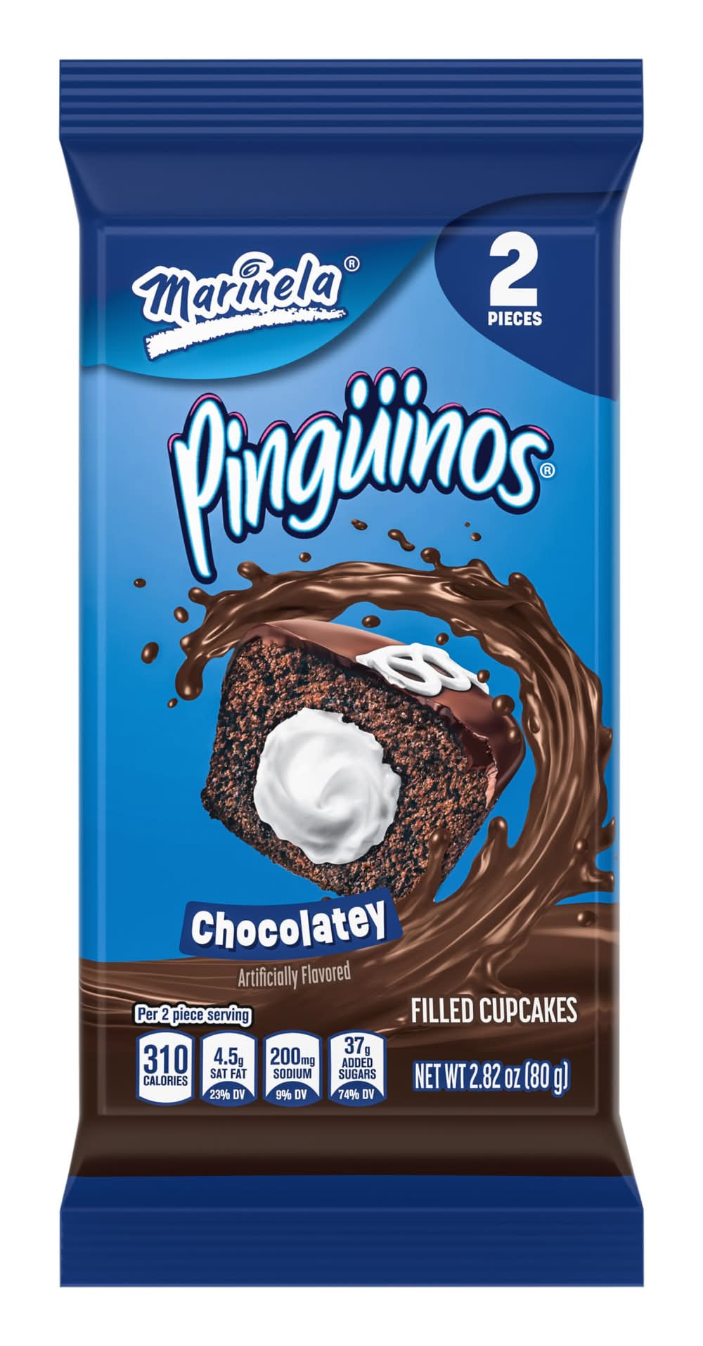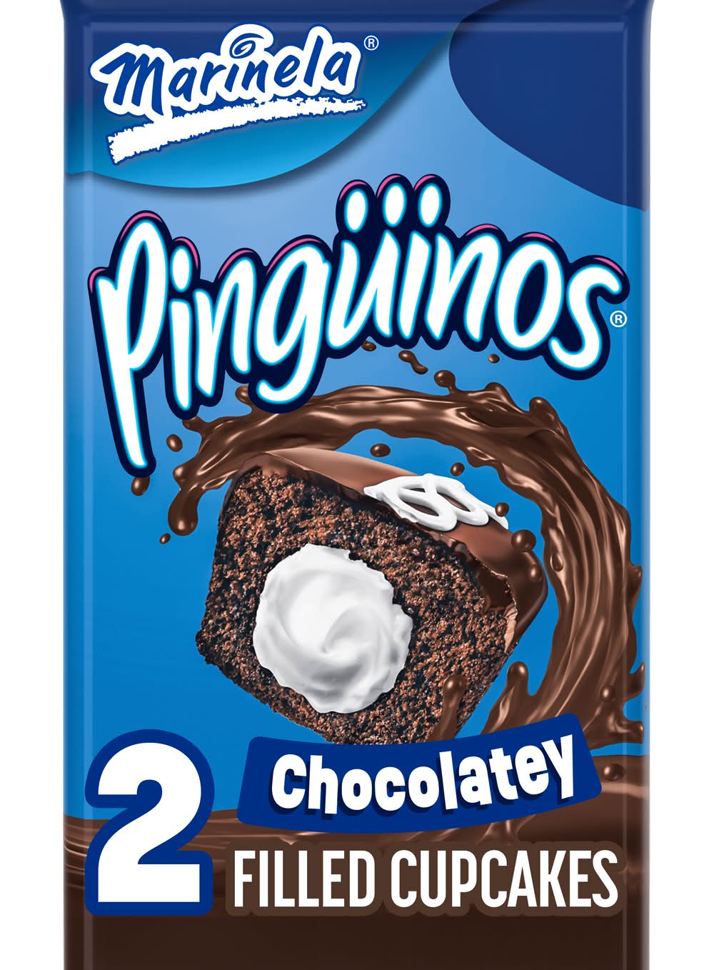 Are you in the mood for something delicious? Pingüinos cupcakes will satisfy your craving. Enjoy the delectable taste of a delicious artificially flavored chocolate cupcake filled with rich crème, topped off with a rich chocolate coating and a decorative white frosting swirl for a taste you won’t forget. No need to go to the bakery; Pingüinos cupcakes are wrapped for freshness, every time. They are a great snack for kids to enjoy with a glass of ice-cold milk while sharing with friends, or as a special treat after their soccer game. Adults love Pingüinos cupcakes with their afternoon coffee or as an indulgent little dessert. Marinela stands for fun! Our products include favorites like crème-filled chocolate cupcakes and butter cookies and unique varieties like orange and raisin cakes to satisfy your sweet tooth. Take one bite of any of our cookies, snack cakes, or pies, and you’ll get a taste of how cool it is to go back to your childhood again! Marinela Is in Me. Marinela Is in You. • Flavor: Chocolate • Bimbo Bakeries USA, Inc., Horsham, PA, 19044