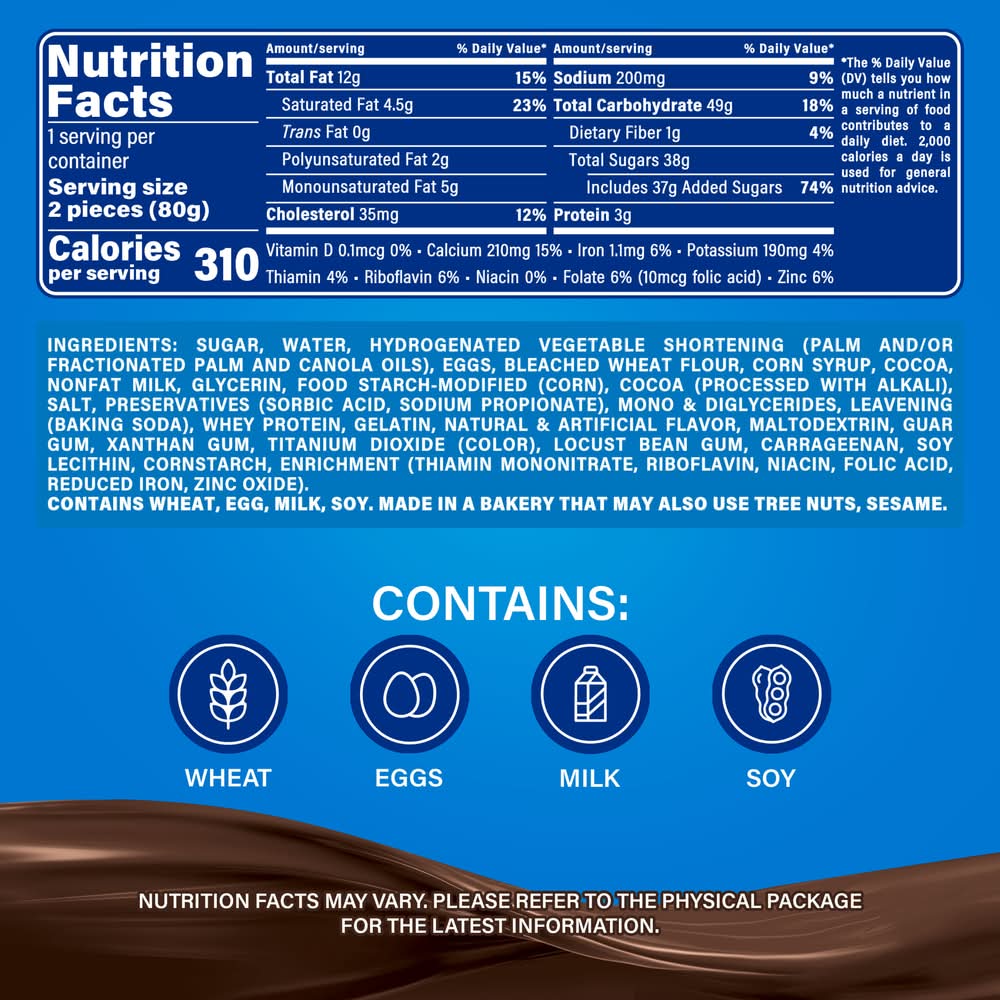 Ingredients: SUGAR, WATER, HYDROGENATED VEGETABLE SHORTENING [PALM AND/OR FRACTIONATED PALM, CANOLA OIL], EGGS, BLEACHED WHEAT FLOUR, CORN SYRUP, COCOA, NONFAT MILK, GLYCERIN, FOOD STARCH-MODIFIED (CORN), COCOA (PROCESSED WITH ALKALI), SALT, PRESERVATIVES [SORBIC ACID, SODIUM PROPIONATE], MONO DIGLYCERIDES, LEAVENING [BAKING SODA], WHEY PROTEIN, GELATIN, NATURAL ARTIFICIAL FLAVOR, MALTODEXTRIN, GUAR GUM, XANTHAN GUM, TITANIUM DIOXIDE (COLOR), LOCUST BEAN GUM, CARRAGEENAN, SOY LECITHIN, CORNSTARCH, ENRICHMENT [THIAMIN MONONITRATE, RIBOFLAVIN, NIACIN, FOLIC ACID, REDUCED IRON, ZINC OXIDE], . Contains: CONTAINS EGG, MILK, SOY, WHEAT.